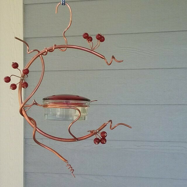 The bowl fits tightly in the copper coil. Pushing up on the bowl from the bottom helps to remove it. PLEASE BE CAREFUL WHEN OPENING THE SMALL BOX CONTAINER THE JAR AND LID. This feeder is 14 inches long(top of hanger to bottom of vines) and 11 inches wide at its largest points. These feeders will be made as they are ordered and each may vary slightly as they are handcrafted.